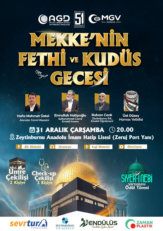 Zeytinburnu Anadolu İmam Hatip Lisesi Konferans Salonu, 31 Aralık akşamı anlamlı bir programa ev sahipliği yapacak. Anadolu Gençlik Derneği (AGD) Zeytinburnu Şubesi tarafından düzenlenen “Mekke’nin Fethi ve Kudüs” programı, saat 20.00 itibariyle başlayacak.